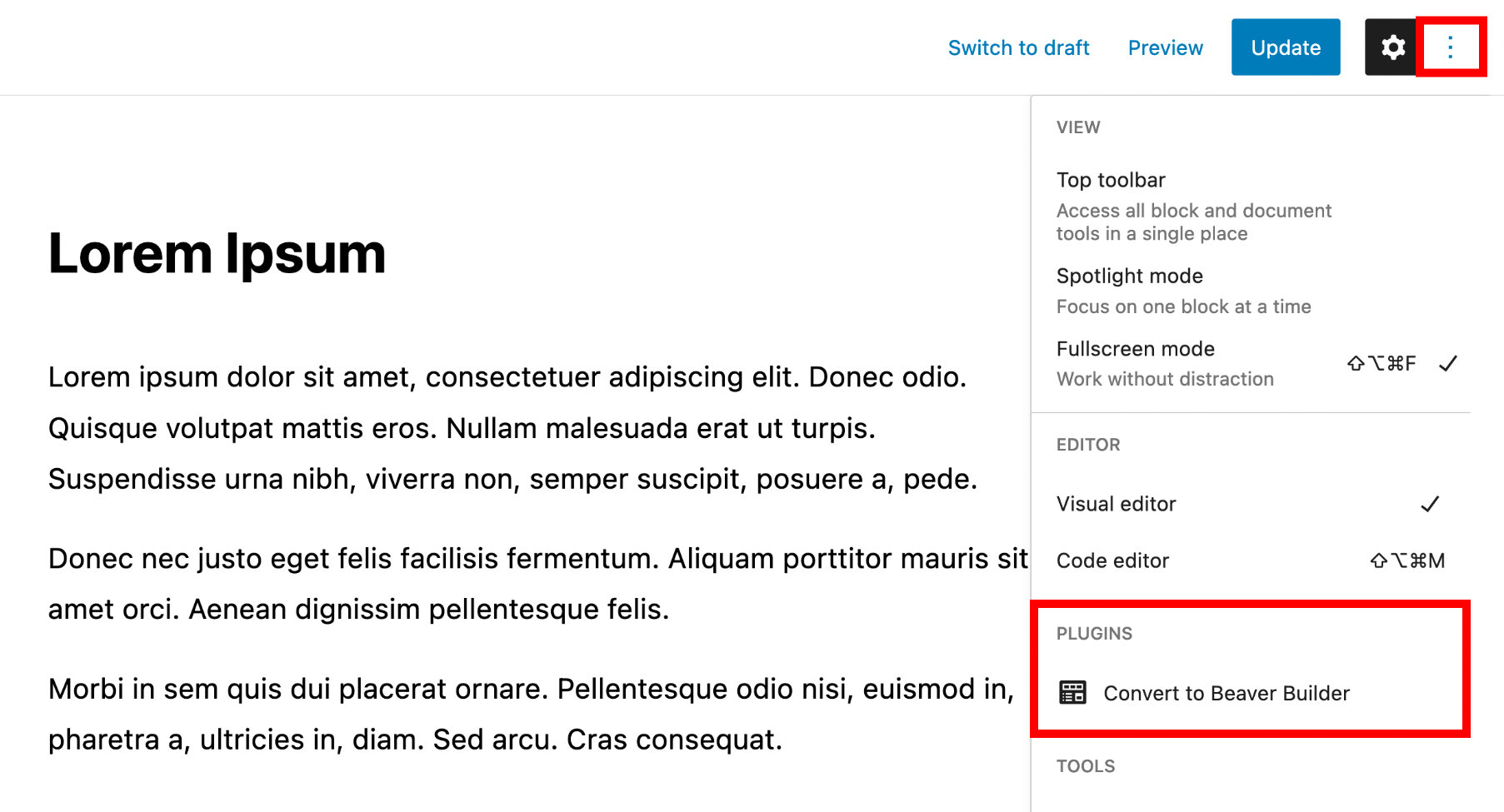 2. In the Plugins section, choose Convert to Beaver Builder, as shown in the following screenshot.