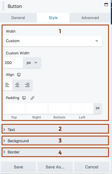 • Width Auto width: Width adjusts to fit the text and icon. Full width: The width expands to the content area minus the module's margin settings. Custom: You can set a custom width in px, vw, or %.