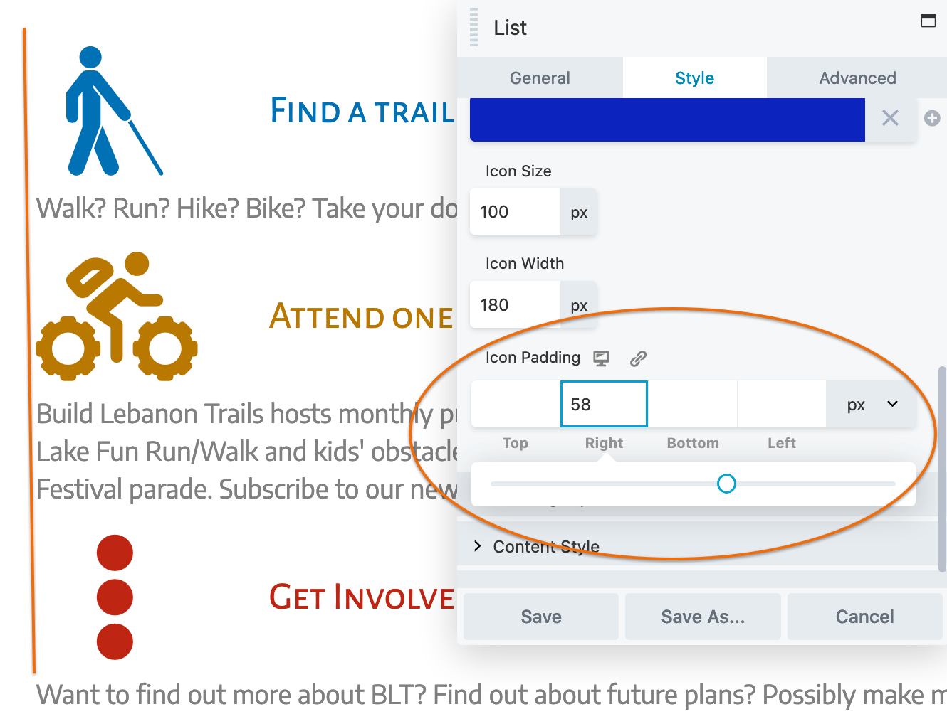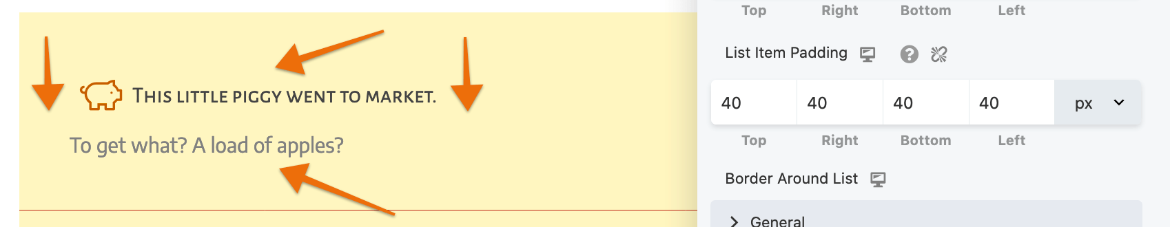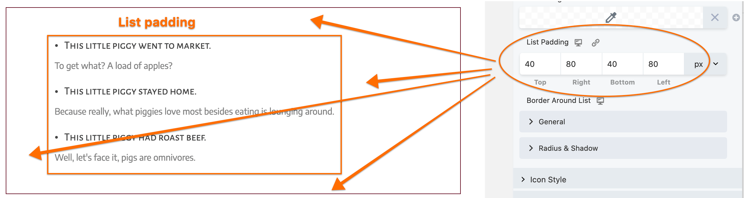 • List item padding (responsive) Adds padding around the list items themselves, as shown in this screenshot. If you want even more control over padding around list items, use the List item padding setting on the Style tab for individual list items.