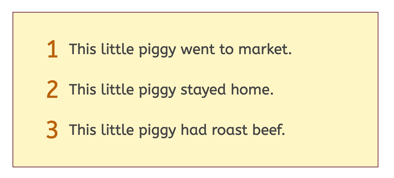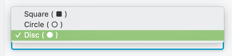 This is the typical bulleted list, but you can choose your list marker and adjust its size. You can choose from the standard circle and square icons that are available as list item markers for standard unordered lists.