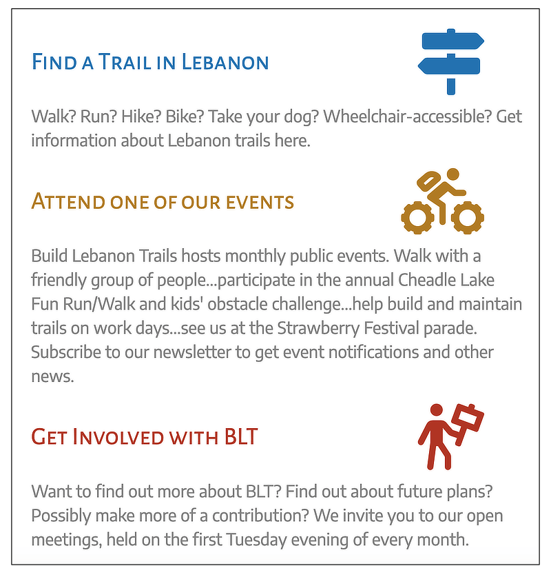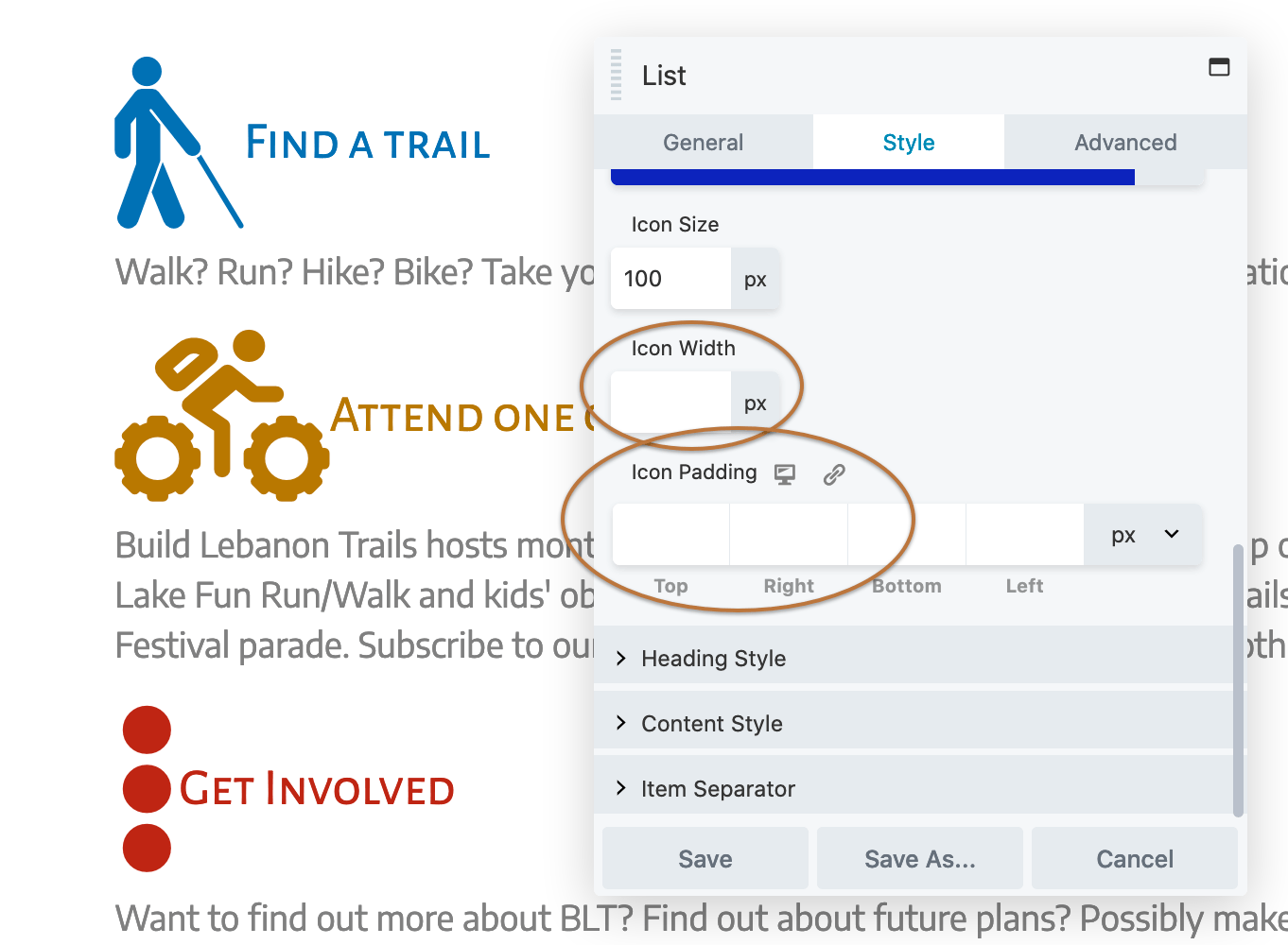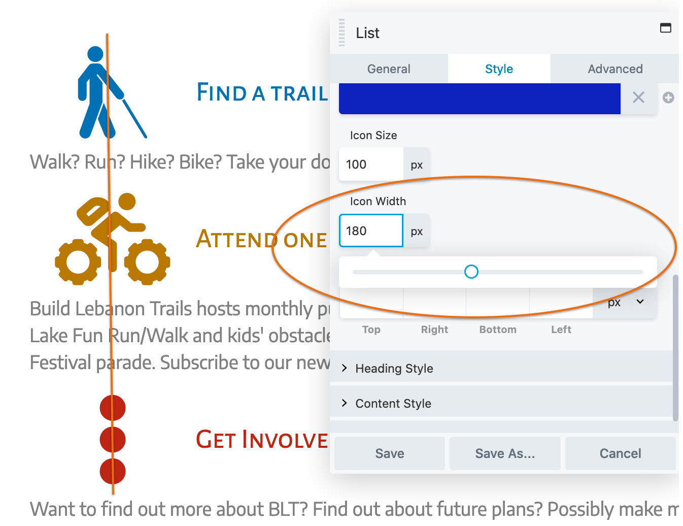 • Icon width Determines the width of the icon's boundary box. This setting is useful when some icons in your list are wider than others and you want to vertically align them. To achieve vertical alignment, the Icon width setting must be greater than the sum of icon size + icon right padding + icon left padding. Here's a method to adjust Icon width, and Icon padding so the icons are vertically centered but the widest icon is aligned to the left edge of the list. First, here's a list with Icon size set to 100px with no settings for Icon width or Icon padding. You can see that the icons are not vertically centered. Click in the Icon width field and use the slider to vertically align the icons and create the distance you want between the icons and the heading text. Because the icon size is 100px, the icon width will have to be at least 100px for the icons to be vertically aligned. Click in the Right setting for Icon padding and move the slider to the right until the widest icon is as far to the left as you want it:
