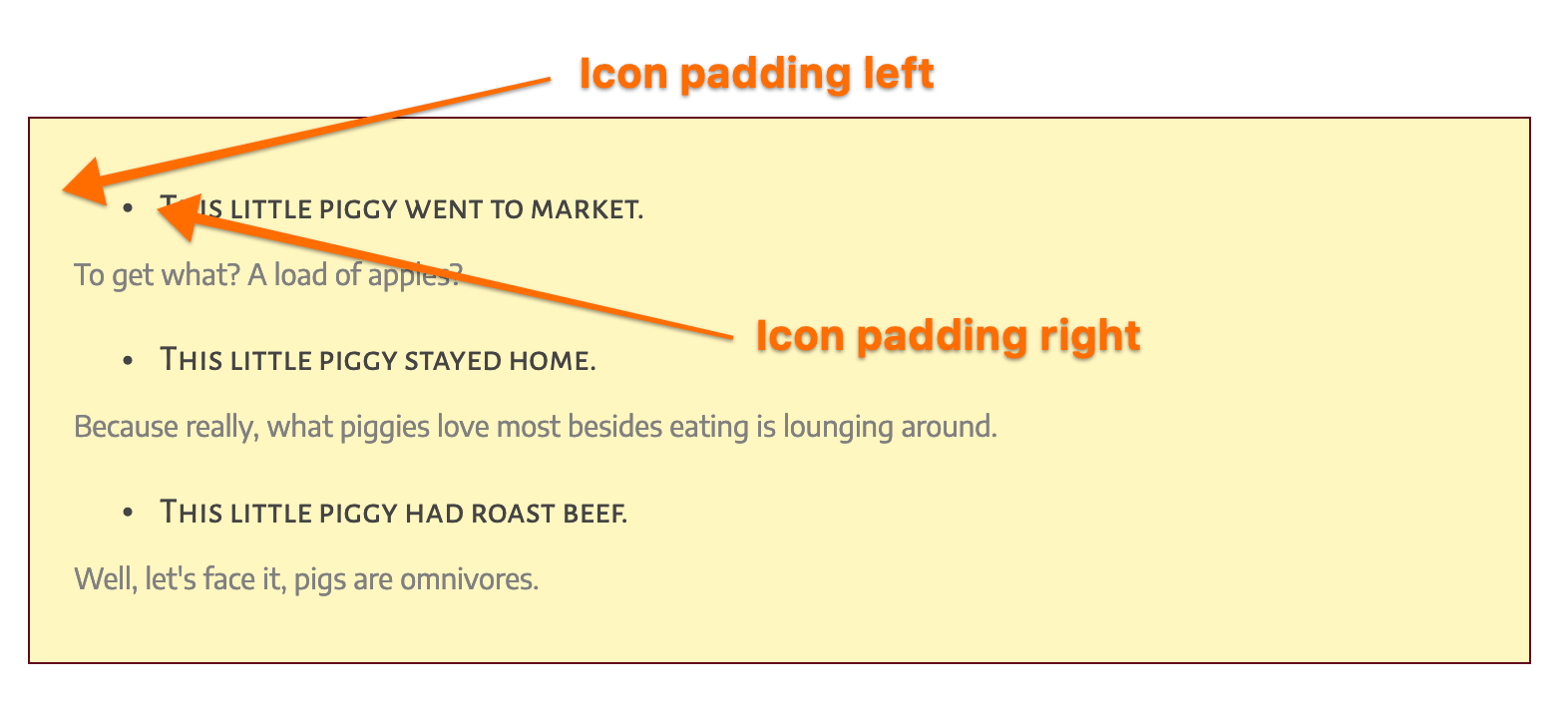 • Icon padding (responsive) Increases padding between the icon and icon's border-box. If you have icons on the left, increasing the left icon padding indents the line and increasing the right icon padding increases the space between the icon and the text, as shown in this screenshot. To adjust the vertical position of the icons, tweak the top or bottom padding.