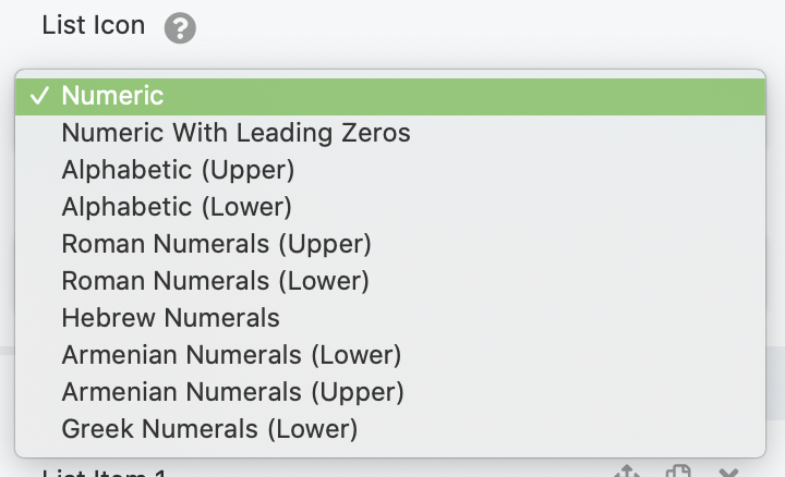 • List icon Chose the icon for the list item marker. The choices depend on which type of list you choose, as described in the first section of this article.