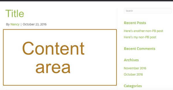 The single post's header, footer, sidebar, post title, featured image, post info, and post navigation are outside of the content area and are configured within the Beaver Builder Theme in Customize > Content.