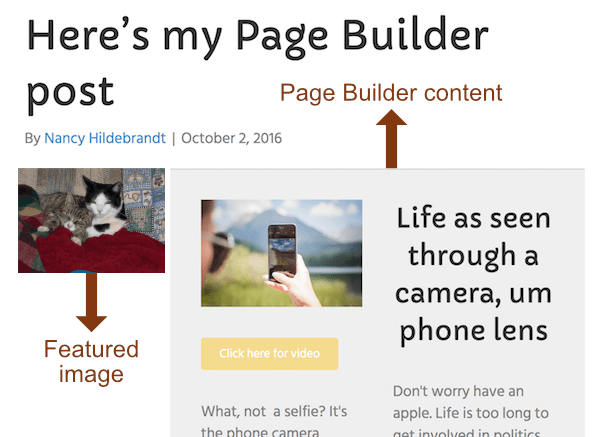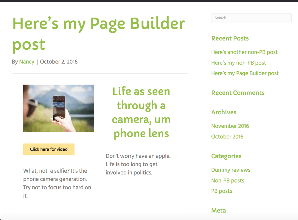 Here's a post with a Beaver Builder two-column layout in the content area. In this example, the first column includes a Photo and a Button module. The second column has a Heading and a Text Editor module.