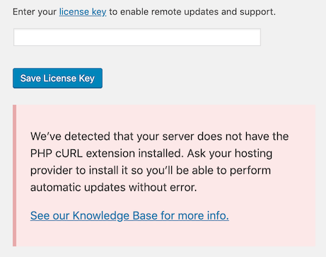 When cURL is not installed, there's a warning at Settings > Beaver Builder on the License tab, as shown in the following screenshot.