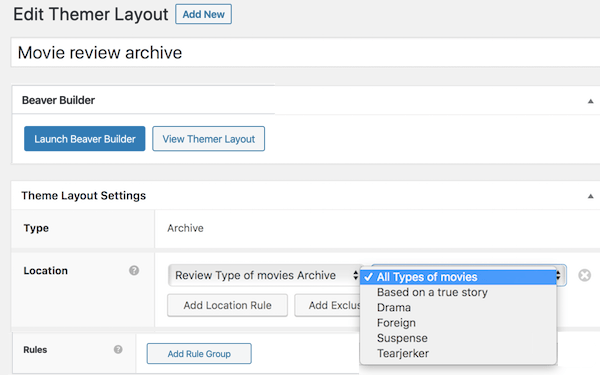 Then you can create an Archive-type themer layout for the taxonomy Type of movie, and in this case, we'll apply it to all of the categories within that taxonomy.