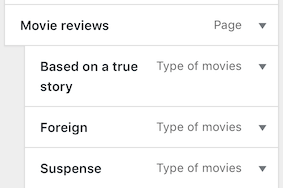 This displays in the nav menu as in this screenshot, with the menu item Movie reviews and the categories in the Type of movies taxonomy as submenu items.