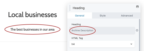 Displays the archive description when there is one. For example, this screenshot shows a category archive, where the Archive description field connection pulls content from the Description field of a post category.
